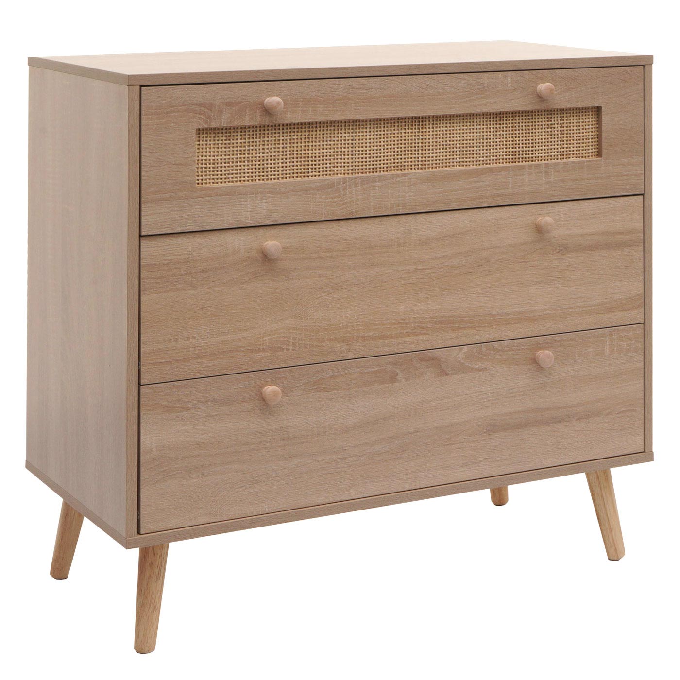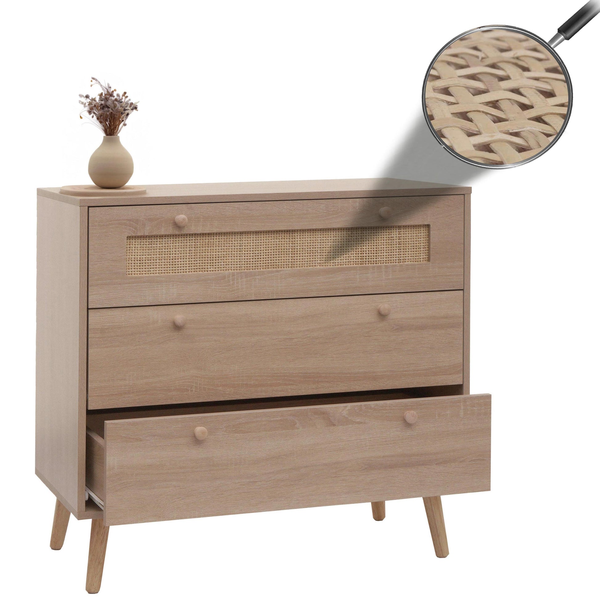 - Ladefront met handgemaakt natuurlijk Kubu-rotan- Oppervlak met melaminecoating bijzonder krasbestendig, waterdicht- Met drie lades- Royale opbergruimte- Stabiele poten van massief hout- Stabiele constructie- Levering zonder decoratie - Met zijn drie lades biedt de ladekast voldoende ruimte voor al...