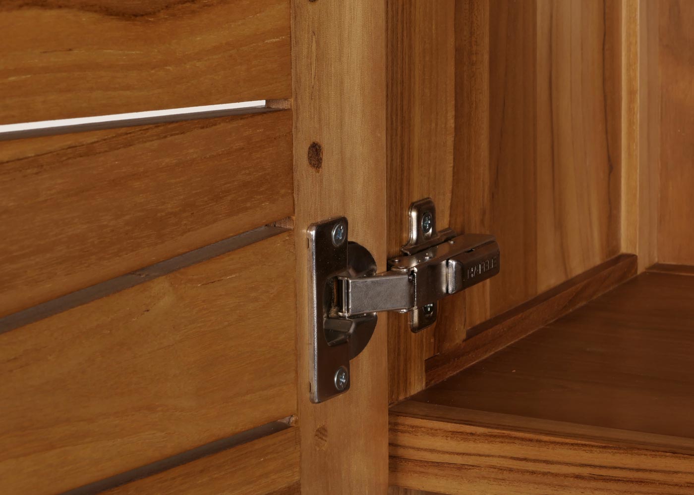 - Ideaal te combineren met andere producten uit onze teakserie- Gemaakt van hoogwaardig B-teak (kernhout, 20-30 jaar) en C-kwaliteit- Kwaliteit B teak overtuigt door lange levensduur- Ook geschikt voor natte ruimtes dankzij de daarin aanwezige oliën- Vier opbergvakken met deuren- Deuroppervlak in aa...