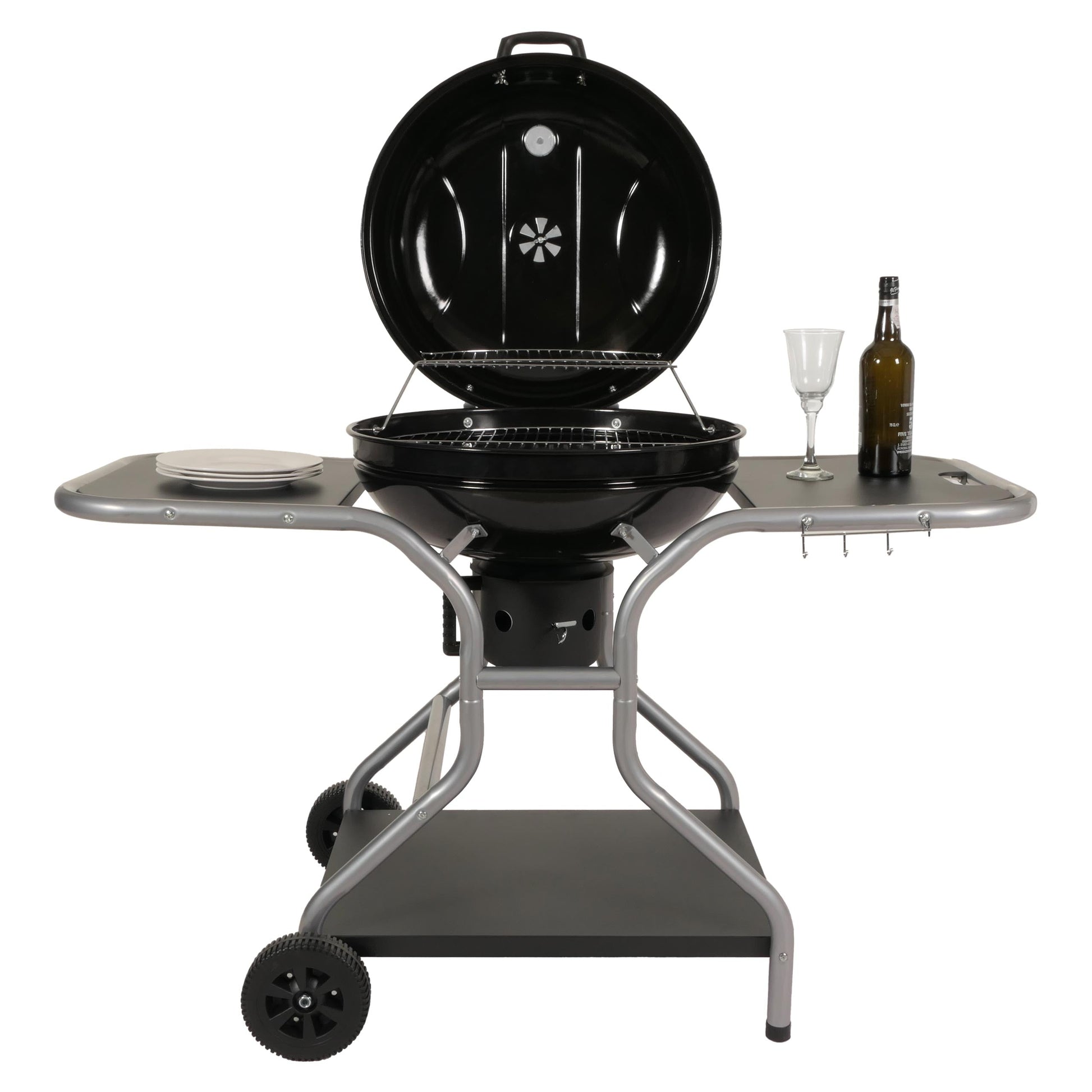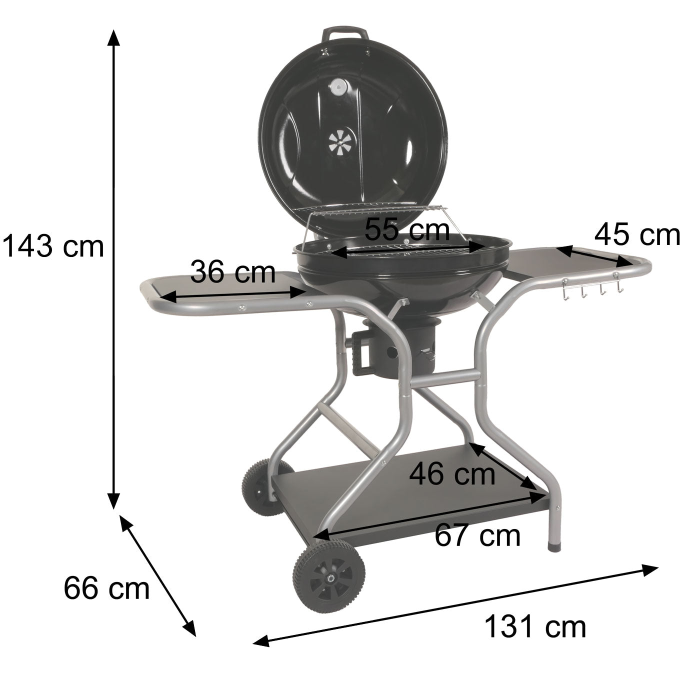 - Grillwagen met wielen en verzonken handgreep- Met drie opbergvakken en haken - Grote afneembare asopvangbak- Grillrooster, verwarmingsoppervlak en houtskoolrek- Verstelbare luchttoevoer en thermometer in het deksel- Met wielen voor eenvoudig transport - Met een groot grilloppervlak, deksel en twe...