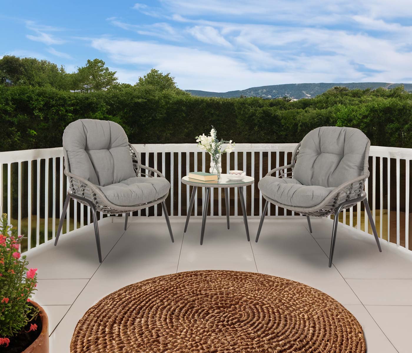 - Leveringsomvang: 2x stoel, 1x bijzettafel- Ideaal voor een balkon of klein terras- Bijzettafel met glazen blad- Bevestiging van het tafelblad met zuignappen- Extra dikke en comfortabele vulling- Waterafstotende en afneembare hoezen- Hoge stofkwaliteit 220 g/m�- Dichte rotan stutten voor meer comfo...