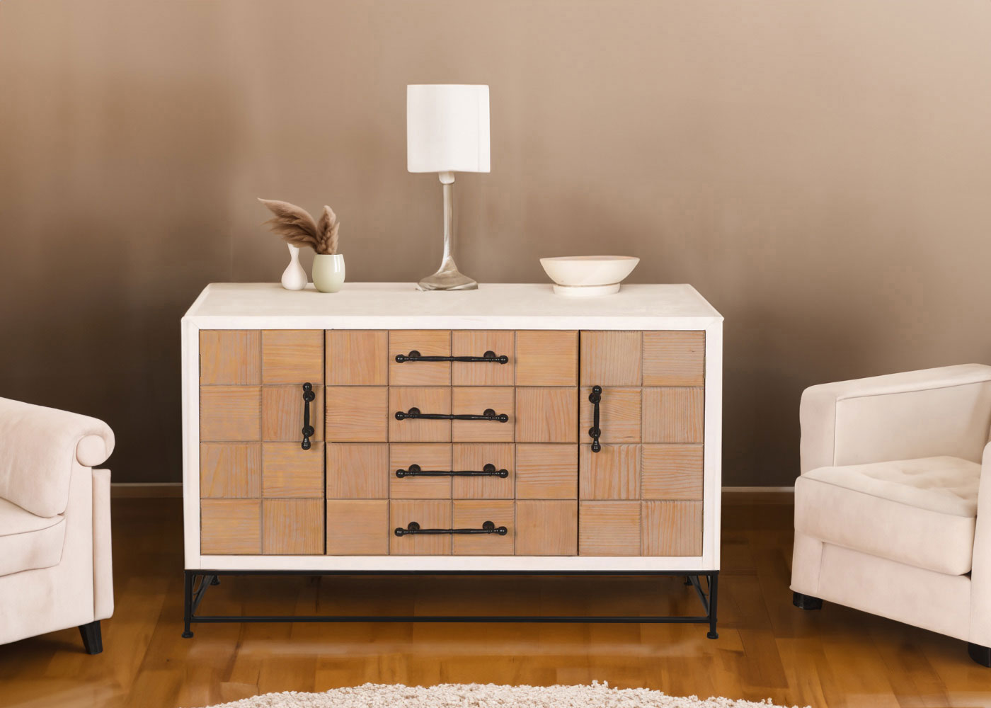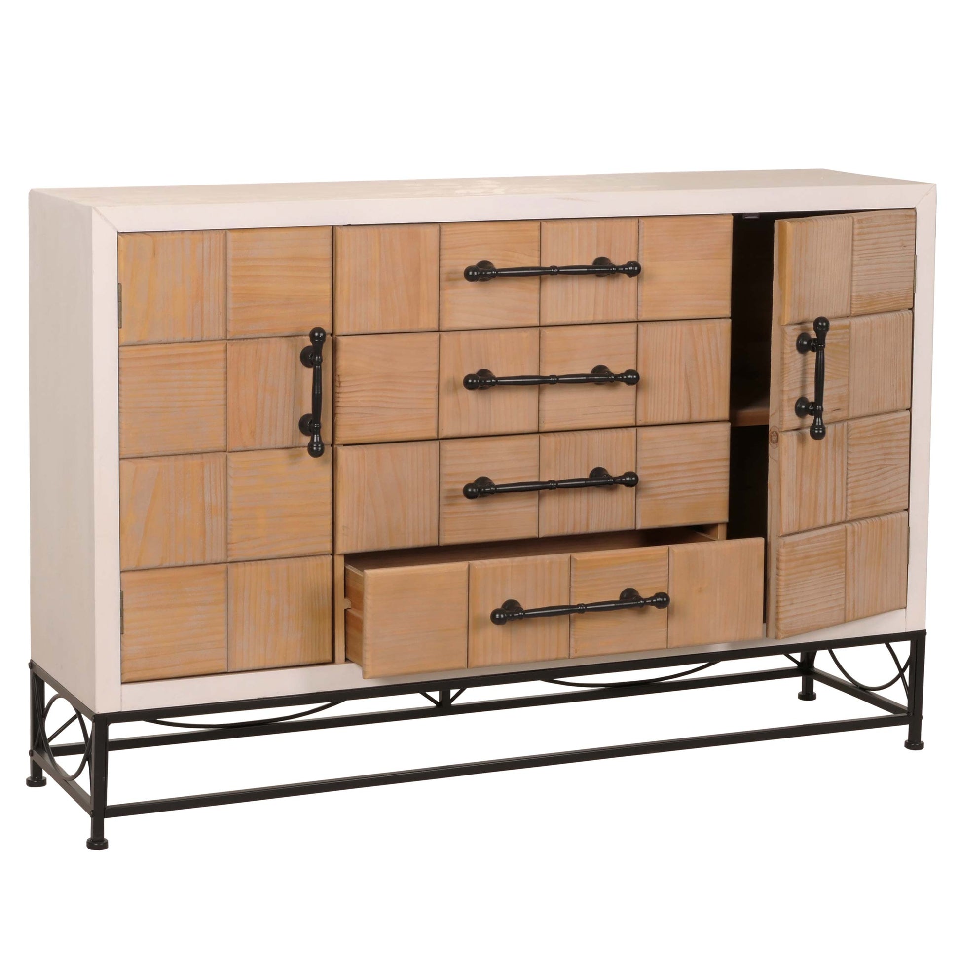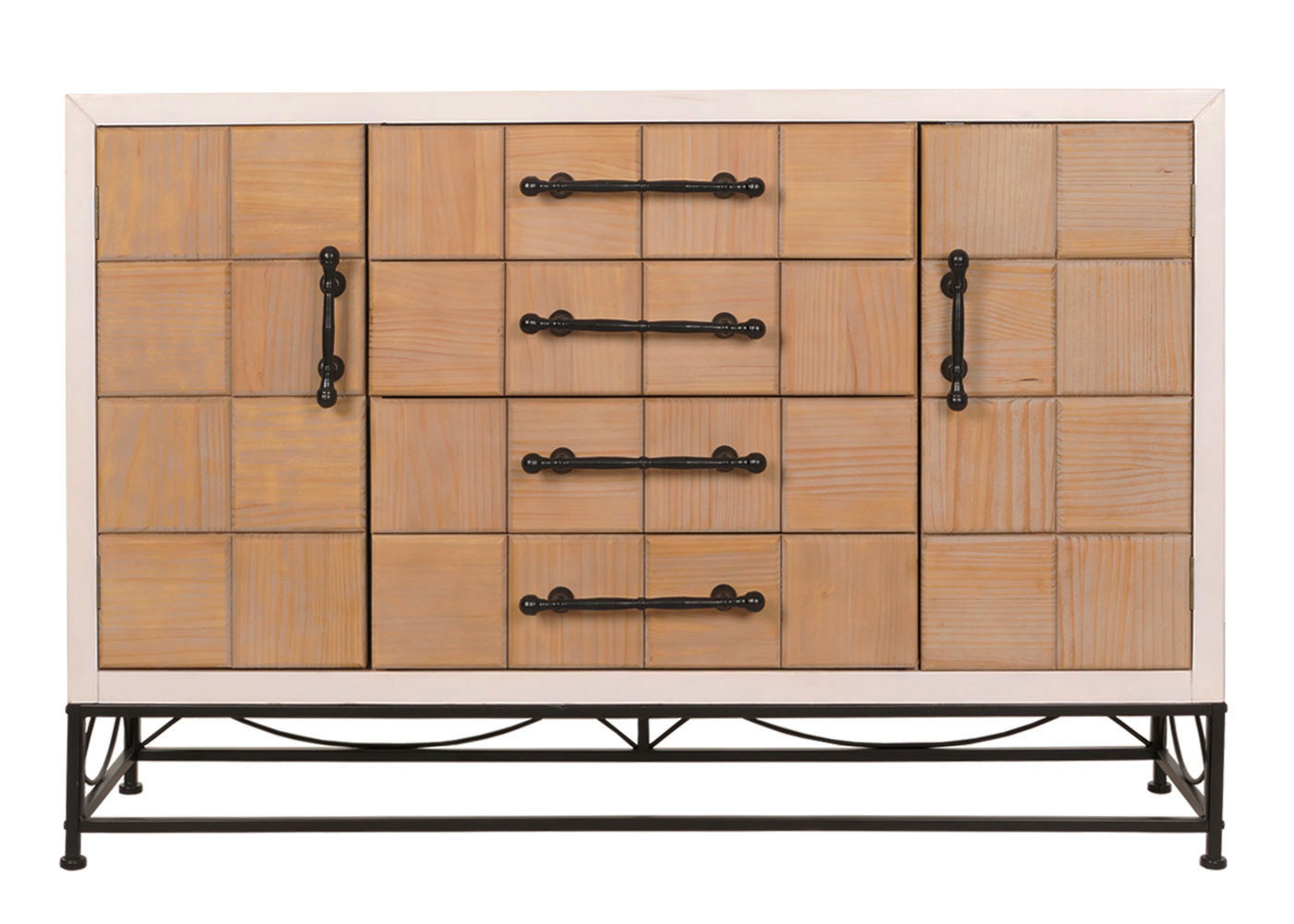- Met vier grote kastvakken- Met vier lades- Deuren met magneetsluiting- Handgrepen van ijzer- Decoratief en stevig ijzeren frame- Fronten van massief dennenhout- Eenvoudig te monteren, je hoeft alleen maar het frame te monteren- Geschikt voor de meubelserie N30 - Het meubelstuk is niet alleen een...