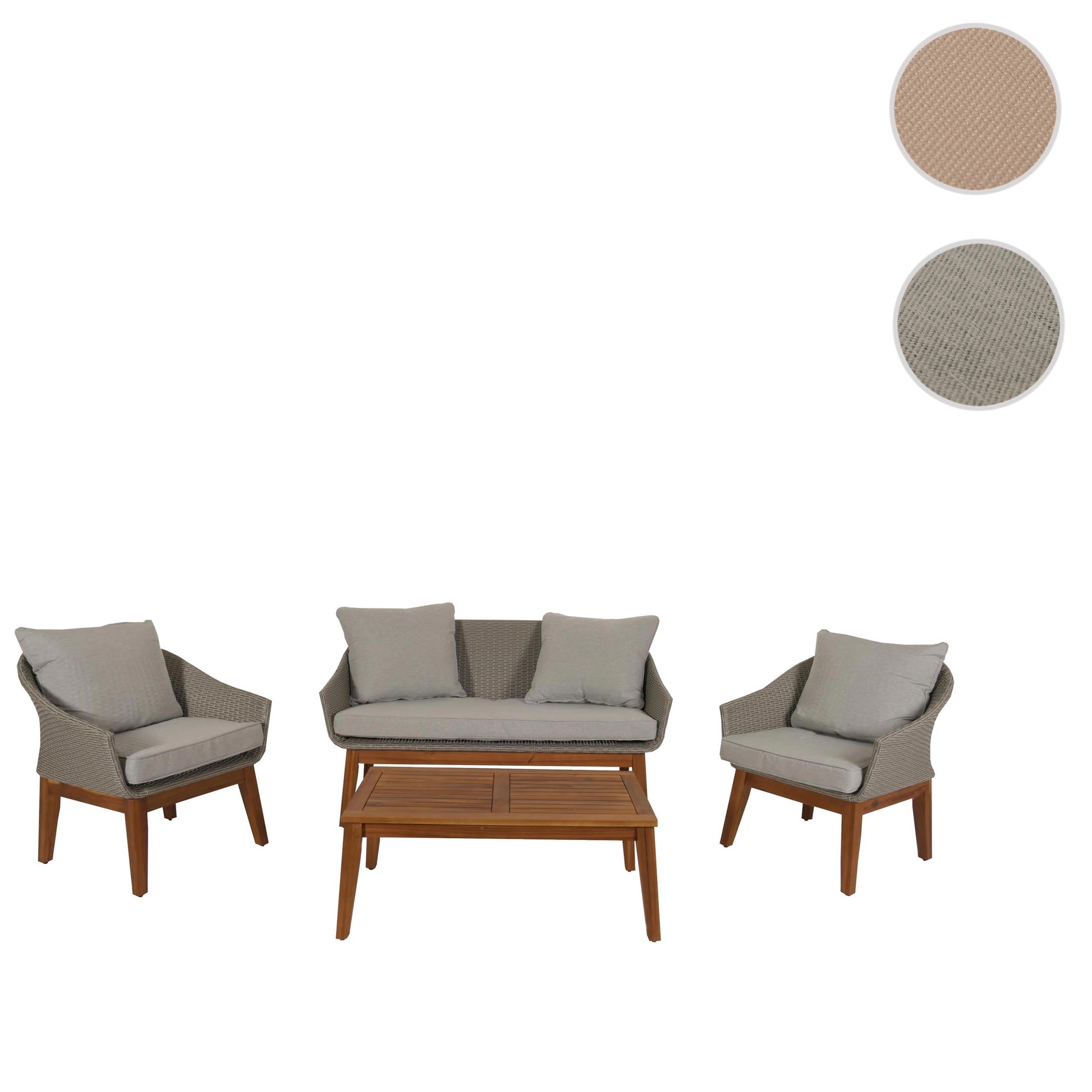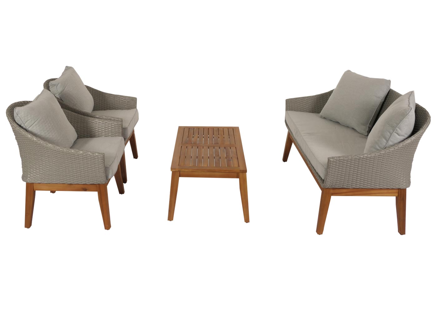 - Waterafstotende hoezen- Hoge stofkwaliteit 230g/m�- BSCI sociale normen getest- Massief acaciahout met structuur- Inclusief zit- en rugkussens- Met vloerbeschermer- Vier zitplaatsen - Maximaal permanent draagvermogen per zit: 120 kg- Maximaal permanent draagvermogen tafel: 50 kg- Levering zonder d...