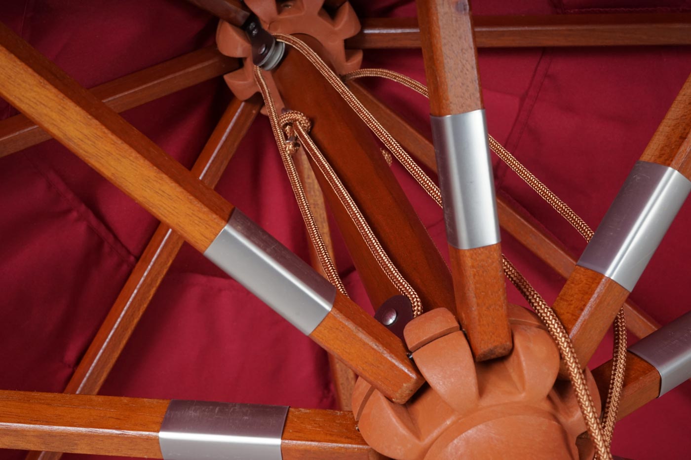 De stevige stand wordt gegarandeerd door de aluminiumversterkte versteviging en de massieve, 5 cm dikke houten stok. Het winddak zorgt ervoor dat er geen gevaarlijke windvangers ontstaan ??en dat de lucht kan circuleren. Zelfs bij een lichte regenbui kunt u rustig blijven zitten. Het waterafstotende, geweven polyesterweefsel zorgt hiervoor. Het uiteinde van de stok is bedekt met een circa 40 cm lange aluminium huls, die voorkomt dat vocht in het hout dringt. Hierdoor kan de parasol veilig in een grondspot of in een parasolstandaard worden gebruikt. Het soepel lopende kabelsysteem maakt het openen en sluiten kinderspel. Dankzij de moderne kleurenselectie is er voor elke smaak een model. Overtuig uzelf van de kwaliteit en het design.
