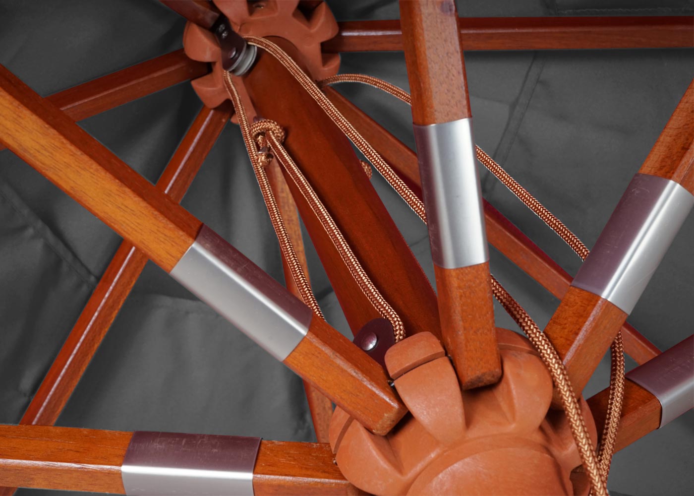 De parasol moet gemakkelijk uitklappen. Gebruik GEEN geweld. Hoewel de baleinen van de parasol extreem verstevigd zijn, bestaat er - zoals bij alle parasols - het risico dat de houten baleinen vastlopen. Reik in dat geval onder het doek voordat u de parasol opent en plaats de houten baleinen op de juiste manier terug. De paraplu kan vervolgens eenvoudig worden uitgevouwen.