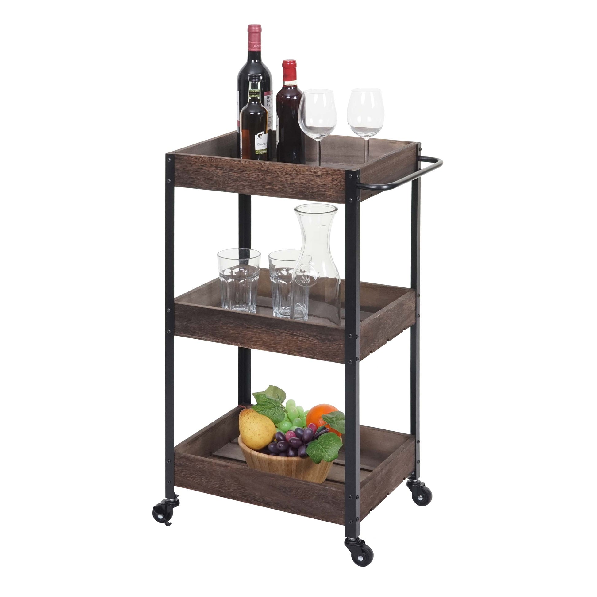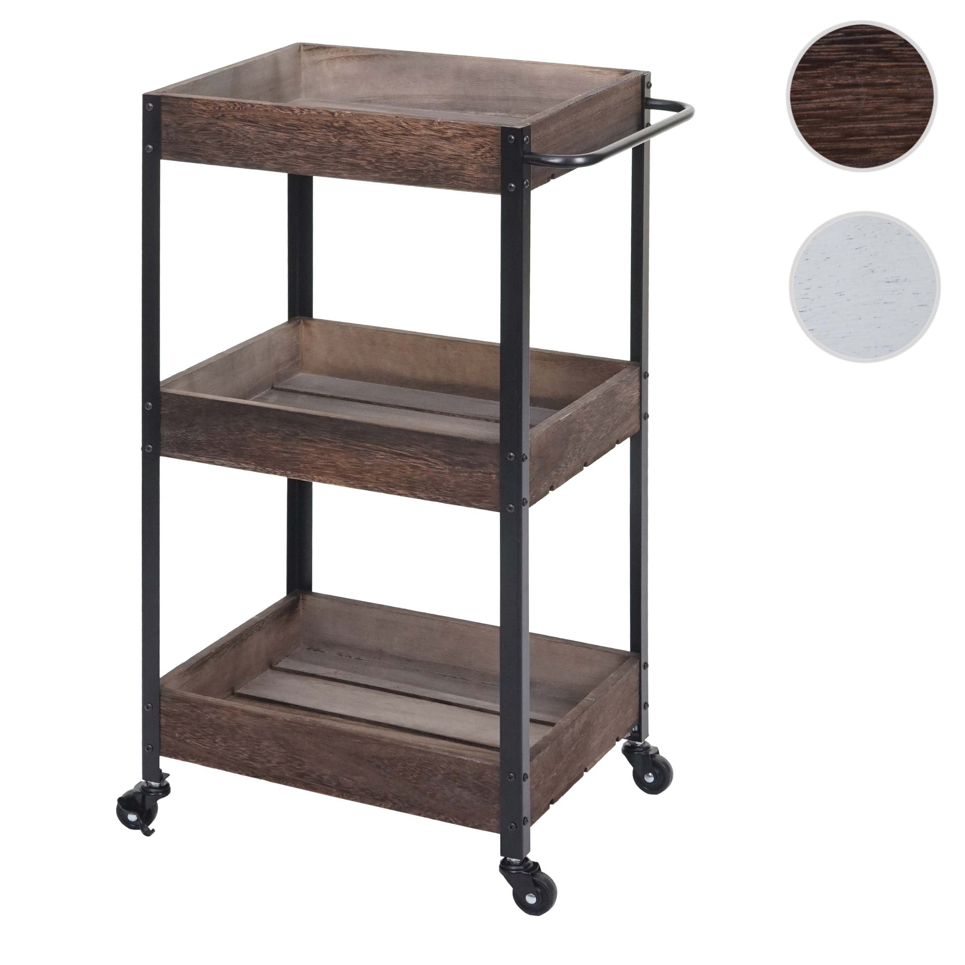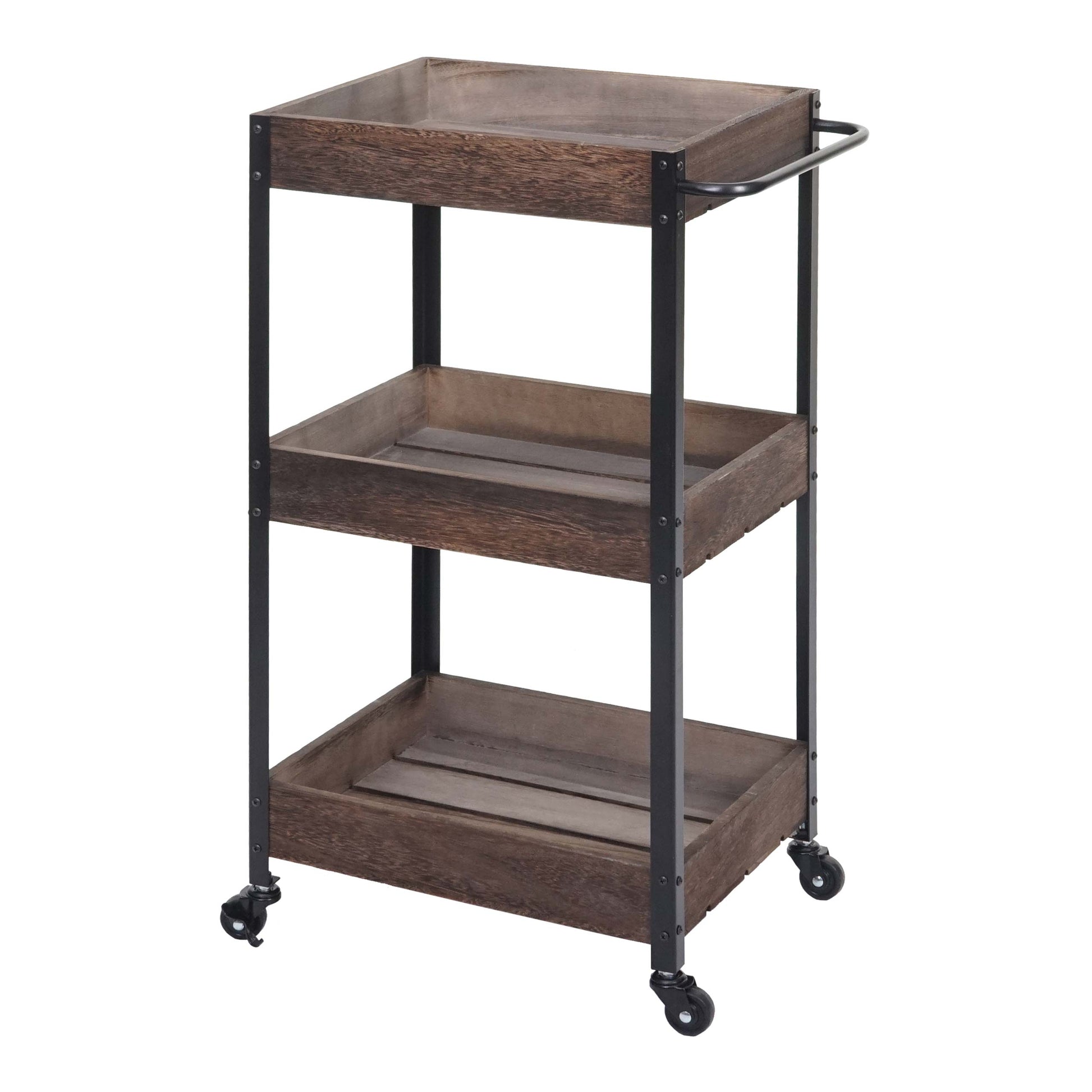 - Drie opbergmanden- BSCI sociale normen getest- Incl. vier wielen- Twee wielen kunnen worden vergrendeld- Stabiele constructie- Geleverd zonder decoratie- Deze prachtige houten trolley is een praktische hulp voor uw huishouden. Of het nu als serveerwagen, barwagen of zijwagen in de badkamer of op k...