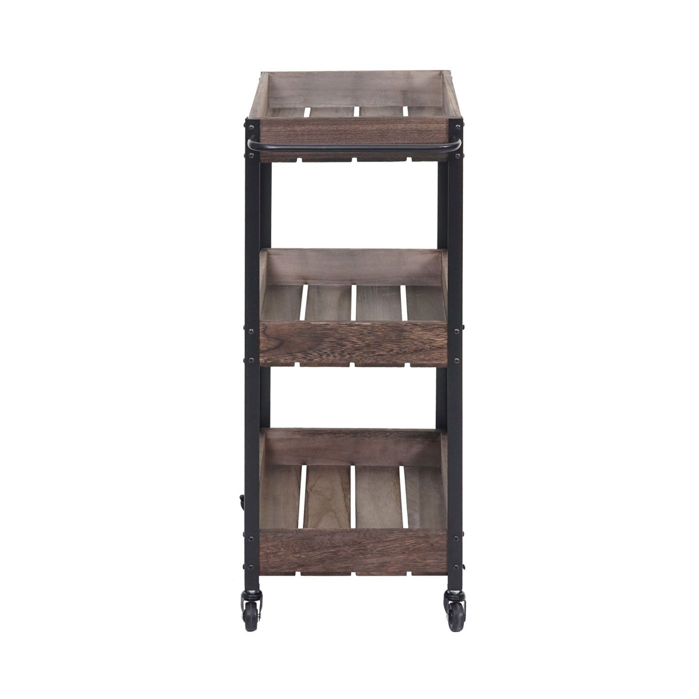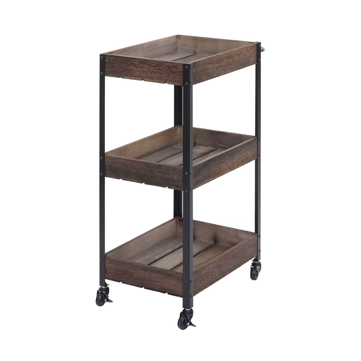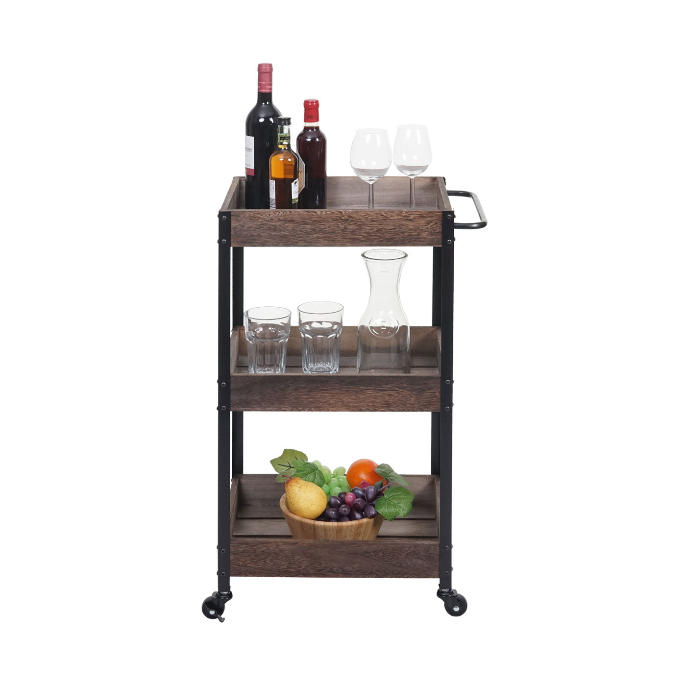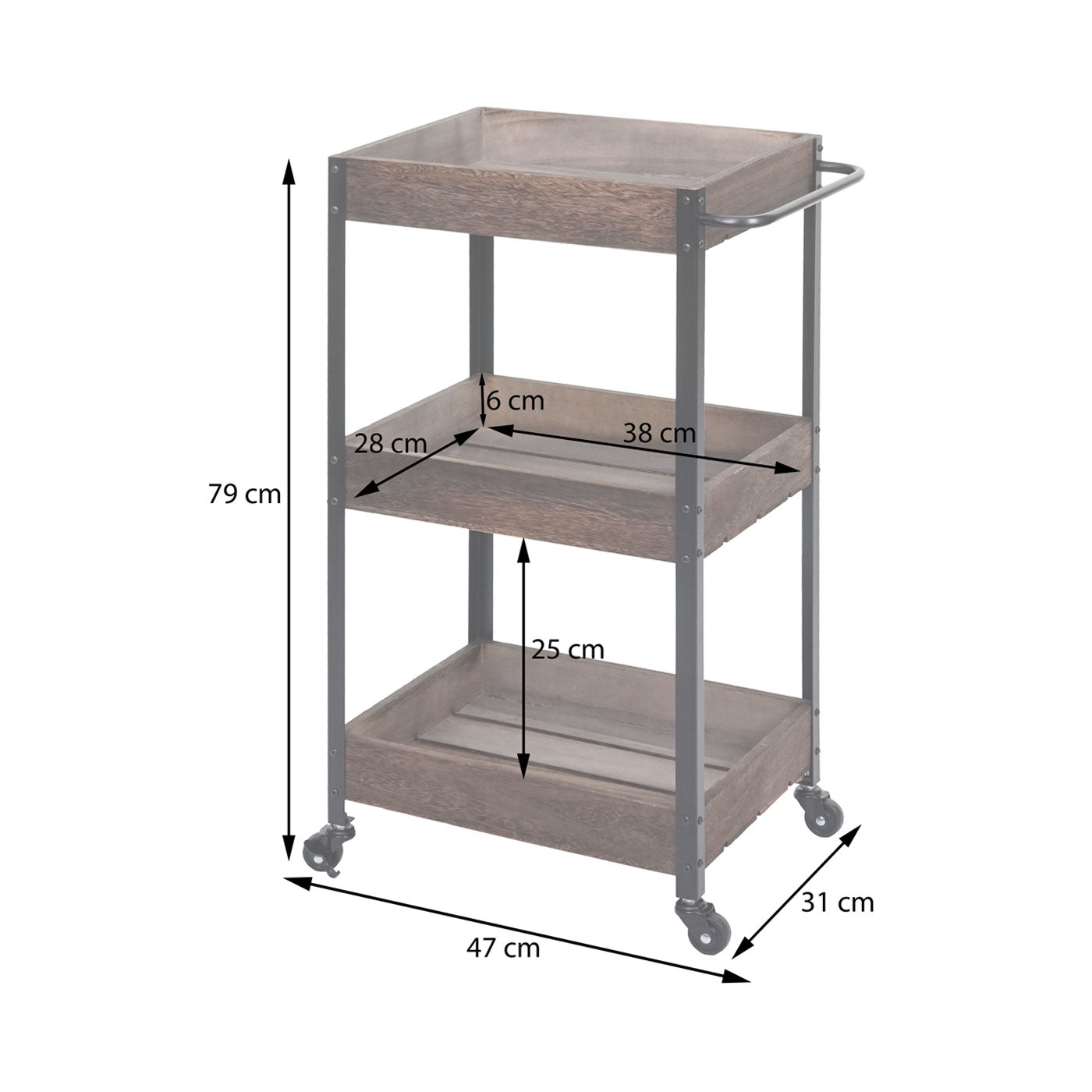 - Drie opbergmanden- BSCI sociale normen getest- Incl. vier wielen- Twee wielen kunnen worden vergrendeld- Stabiele constructie- Geleverd zonder decoratie- Deze prachtige houten trolley is een praktische hulp voor uw huishouden. Of het nu als serveerwagen, barwagen of zijwagen in de badkamer of op k...
