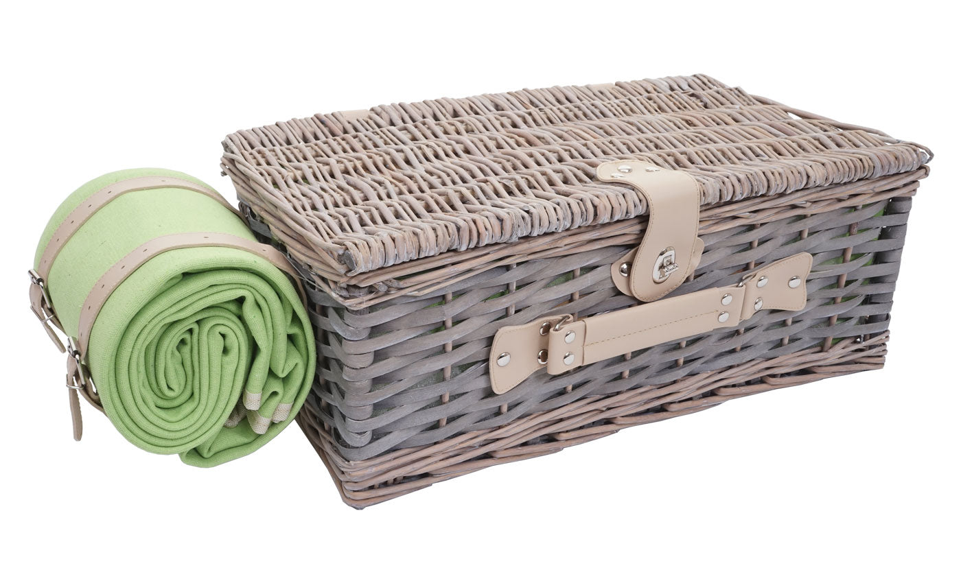 Cosmo Casa - Picknickmandset - Rieten Mand - Porselein - Roestvrij Staal - Grijsgroen