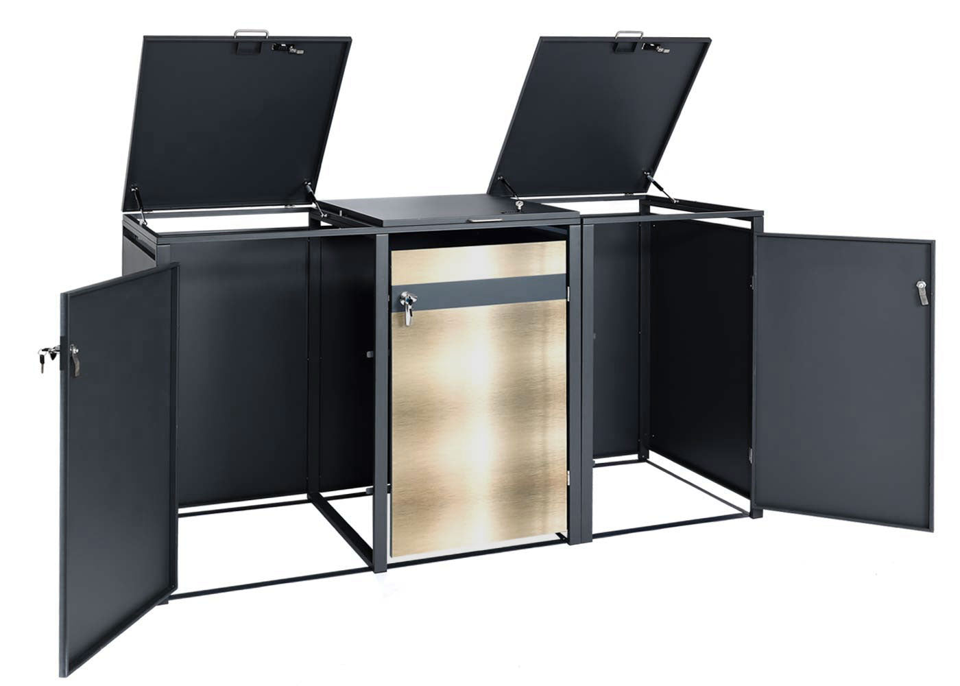 - Voor 3 vuilnisbakken met een inhoud van 80 tot 240 liter- BSCI sociale normen getest - Robuuster door hoger gewicht dan veel concurrenten- Materiaaldikte staal: 0,8 mm (en dus dikker dan sommige concurrenten)- Roest- en UV-bestendig- Uitbreidbaar met andere modellen uit de J82-serie- Deksel kan va...