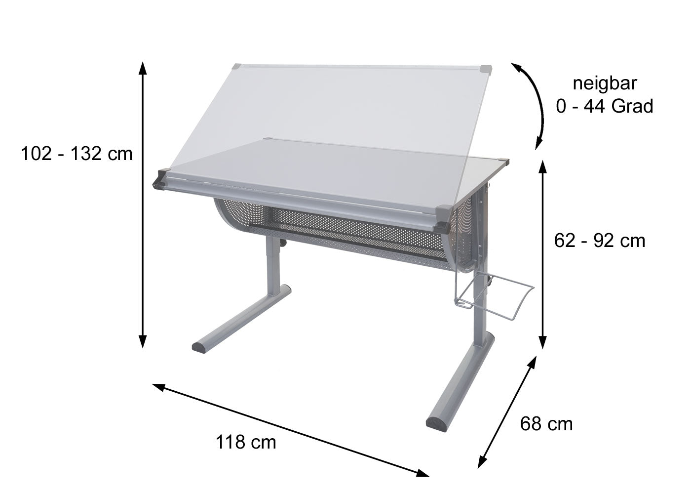 - Modern design- Met geïntegreerde linialen en pennenbak- Werkblad in 10 hoeken kantelbaar- Tafel in hoogte verstelbaar- Met praktische haak- Opbergruimte onder het tafelblad- Tafelblad gelamineerd met PVC-folie- Dit chique bureau in modern design is niet alleen visueel aantrekkelijk, maar biedt ook...